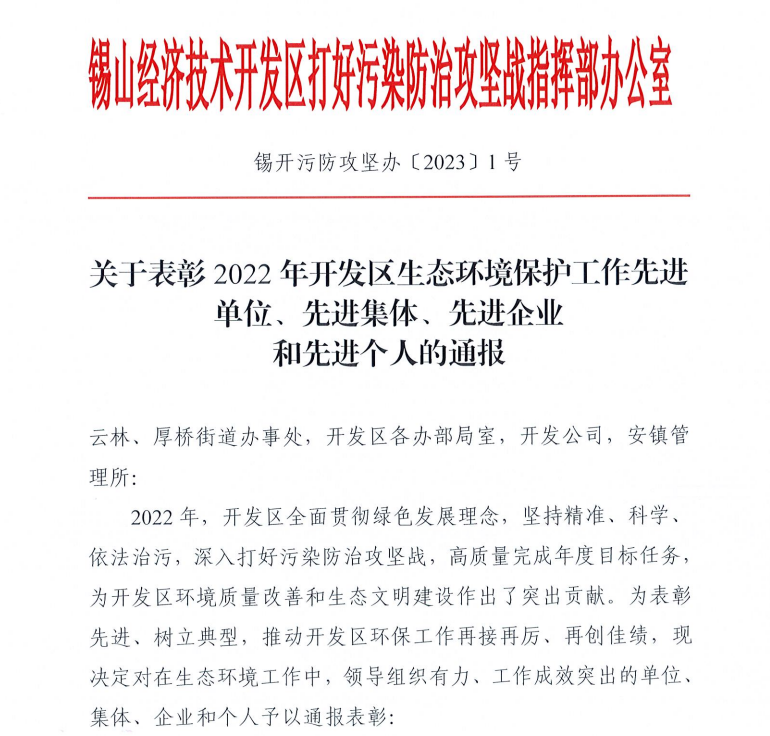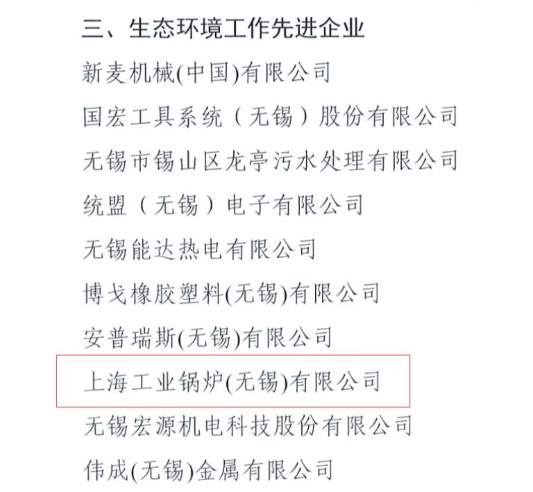 近日,錫山經(jīng)濟開發(fā)區(qū)污防攻堅辦表彰開發(fā)區(qū)生態(tài)環(huán)境保護工作先進單位、集體、企業(yè)和個人,上海工業(yè)鍋爐(無錫)有限公司榮獲“生態(tài)環(huán)境工作先進企業(yè)”稱號。
